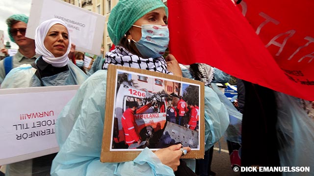 med Palestinademonstrationen på Sveavägen i riktning mot Rådmannagatans